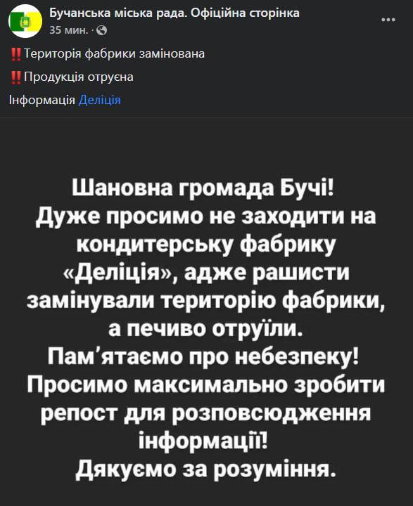 После того, как российские оккупанты отступили с территории Бучи местный горсовет призывает горожан не заходить на территорию кондитерской фабрики "Делиция", поскольку она заминирована, а продукция отравлена.