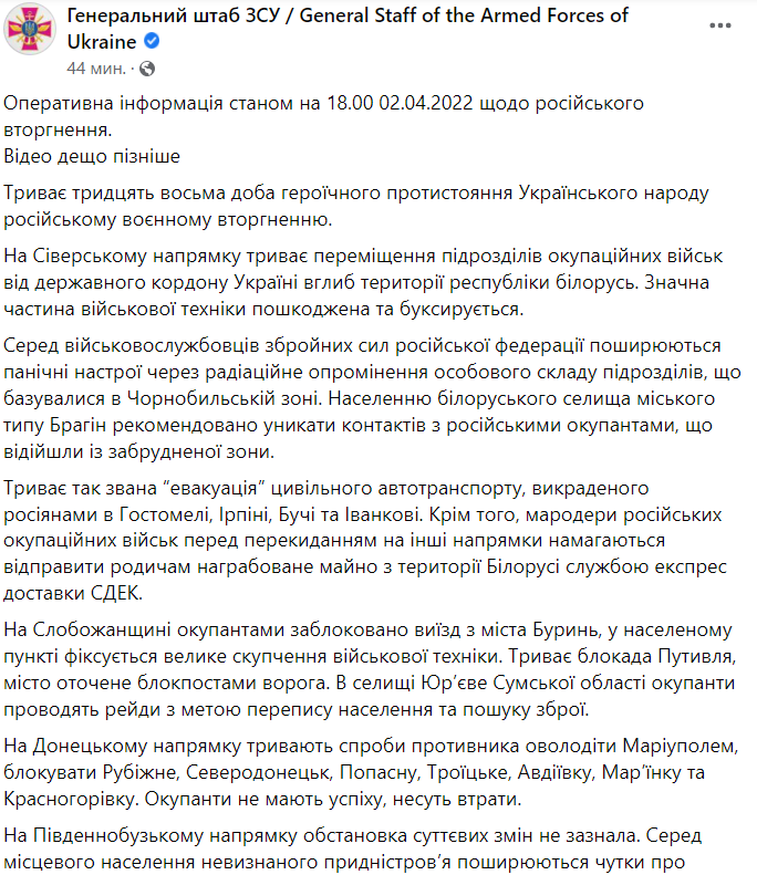 "На Северском направлении продолжается перемещение подразделений оккупационных войск от государственной границы Украины вглубь территории республики Беларусь. Значительная часть военной техники повреждена и буксируется. Среди военнослужащих вооруженных сил Российской Федерации распространяются панические настроения из-за радиационного облучения личного состава подразделений, базировавшихся в Чернобыльской зоне. Населению белорусского поселка городского типа Брагин рекомендовано избегать контактов с российскими оккупантами, отошедшими из загрязненной зоны", - указано в сообщении.