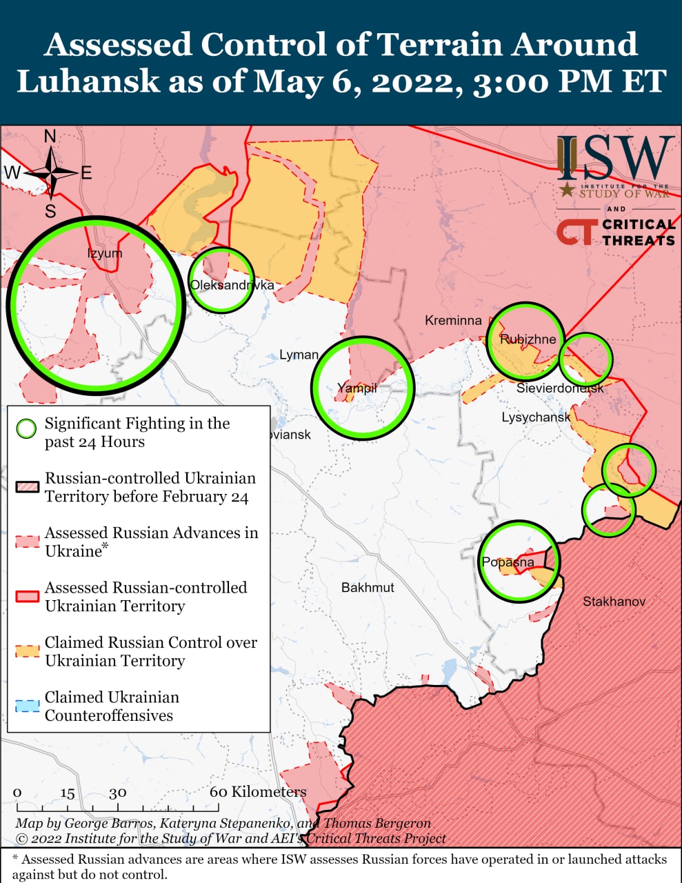 По информации американского "Института изучения войны", российские войска добились небольших успехов на окраинах Северодонецка. К юго-востоку от города, вероятно, захвачен поселок Вороново.