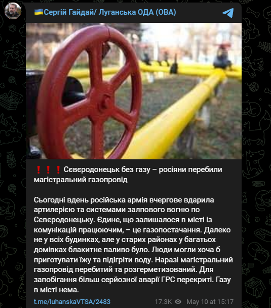 "Сегодня днем российская армия в очередной раз ударила артиллерией и системами залпового огня по Северодонецку. Единственное, что оставалось в городе из коммуникаций работающим – это газоснабжение. Далеко не во всех домах, но в старых районах во многих домах голубое топливо было. Люди могли хотя бы приготовить еду и подогреть воду. В настоящее время магистральный газопровод перебит и разгерметизирован. Для предотвращения более серьезной аварии ГРС перекрыты. Газа в городе нет", - написал он.