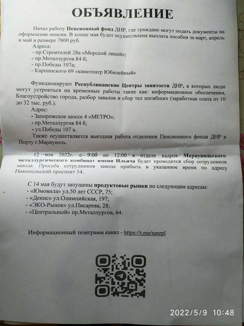 Также оставшихся в городе жителей зовут на сборы работников на Мариупольский металлургический комбинат имени Ильича. Вероятно, таким образом "ДНР" пытаются восстанавливать работу завода.