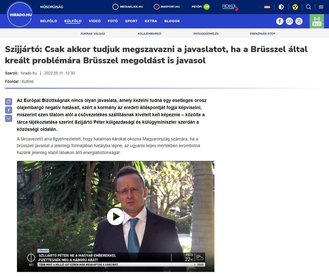 По словам Сийярто, поскольку Еврокомиссия не выдвигает предложений, как противостоять негативным последствиям нефтяного эмбарго, правительство Венгрии будет стоять на том, что введение нефтяного эмбарго против России было бы реалистичным только в том случае, если бы оно касалось только морских транспортных путей, а трубопроводный транзит оставался полностью освобожденным от запретов.