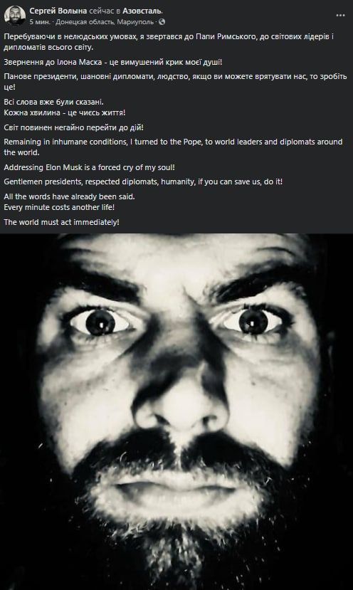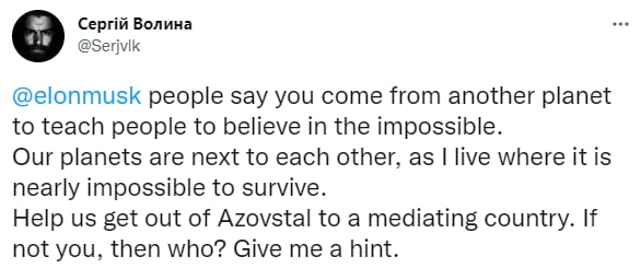 Помогите нам выйти из "Азовстали" в страну-посредника. Если не вы, то кто? Дайте подсказку", - написал "Волына" у себя в Твиттере.