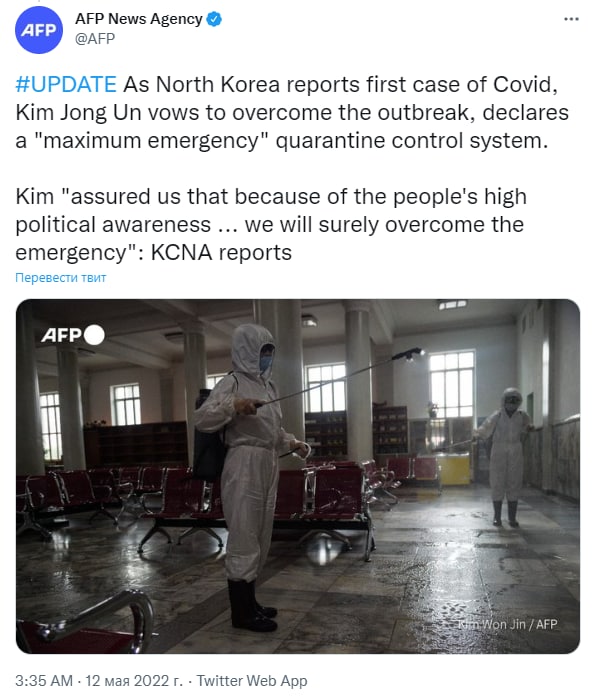 08:09 Власти Северной Кореи впервые заявили о вспышке ковида у себя в стране, сообщает AFP.