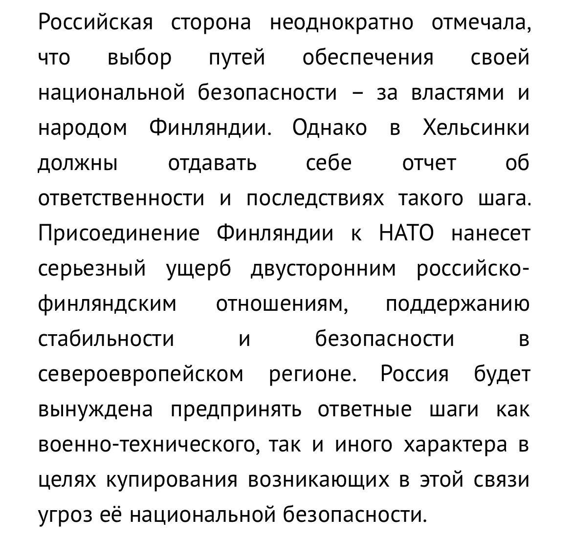 Ранее в МИД РФ говорили о "военно-техническом" ответе в случае вступления Швеции и в Финляндии в НАТО.