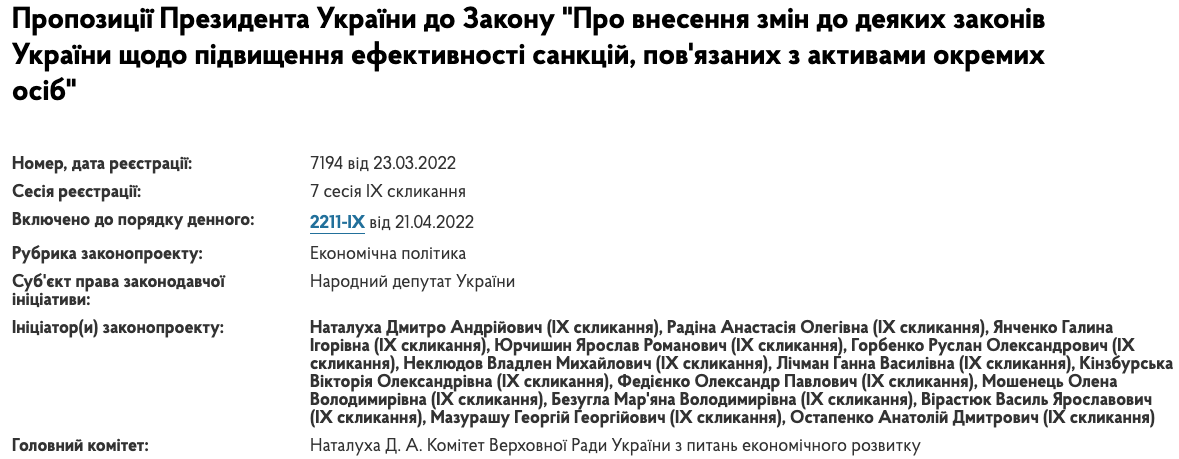 Речь идет о законопроекте №7194 "о повышении эффективности санкций, связанных с активами отдельных лиц".