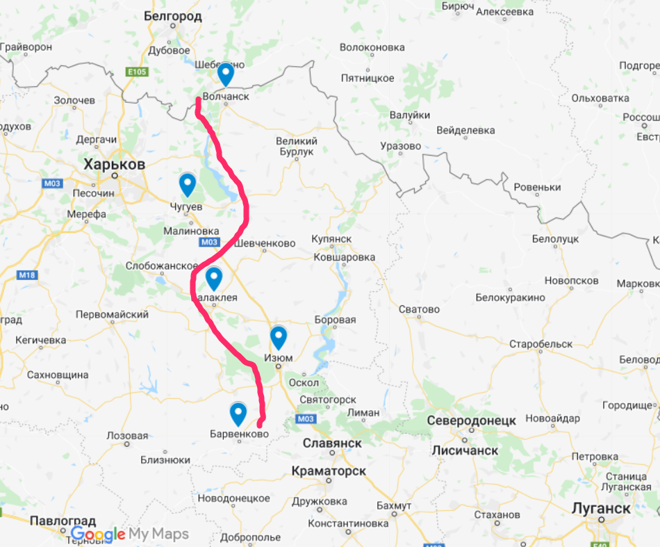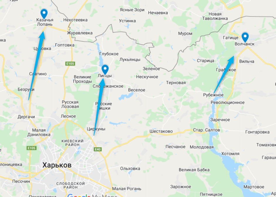 Волчанск - это крайняя северная точка дуги, которая идет на юг восточнее Чугуева, западнее Балаклеи, а далее - Изюма и упирается в позиции ВСУ к востоку от Барвенково. То есть украинская армия, судя по всему, будет пытаться движением на Волчанск оттеснить часть российской группировки от границы.