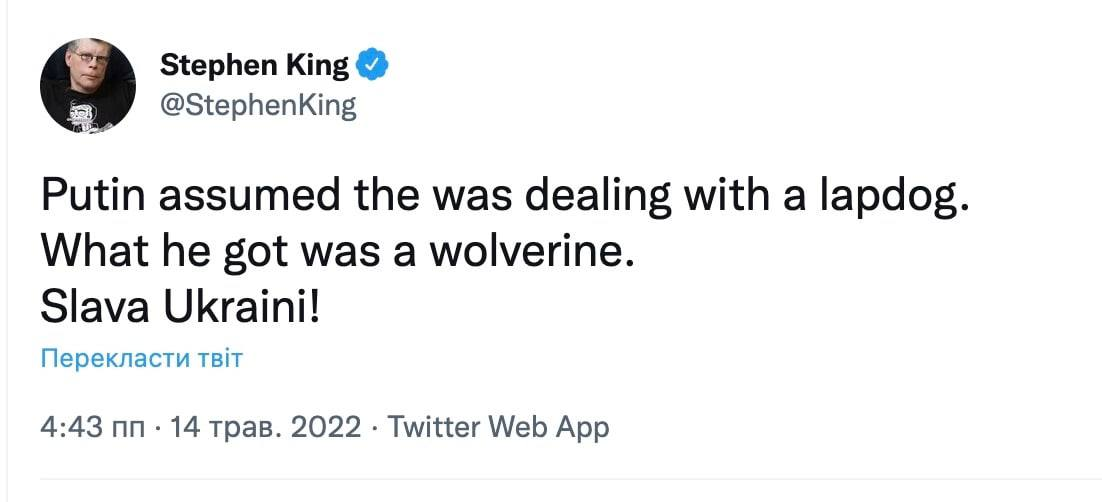"Путин предполагал, что будет иметь дело с комнатной собачкой. Вместо нее он получил росомаху", - заявил Стивен Кинг, завершив свой твит словами "Слава Украине!" - латинским буквами на украинском.