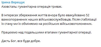 "В интересах сохранения жизней вчера были эвакуированы 52 тяжелораненых наших военнослужащих. После стабилизации их состояния мы их обменяем на российских военнопленных. Работаем над последующими этапами гуманитарной операции", - написала она.