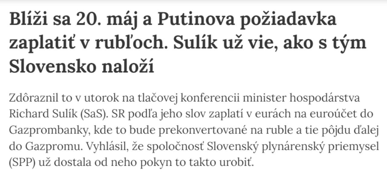 "Словакия заплатит [за газ] в евро на счет в Газпромбанке, а тот перечислит платеж в рубли и направит "Газпрому". Со второй частью операции мы не будем иметь ничего общего. Для нас важно то, что мы платим в евро в Газпромбанк", - привел во вторник сайт братиславской газеты "Правда" слова министра.