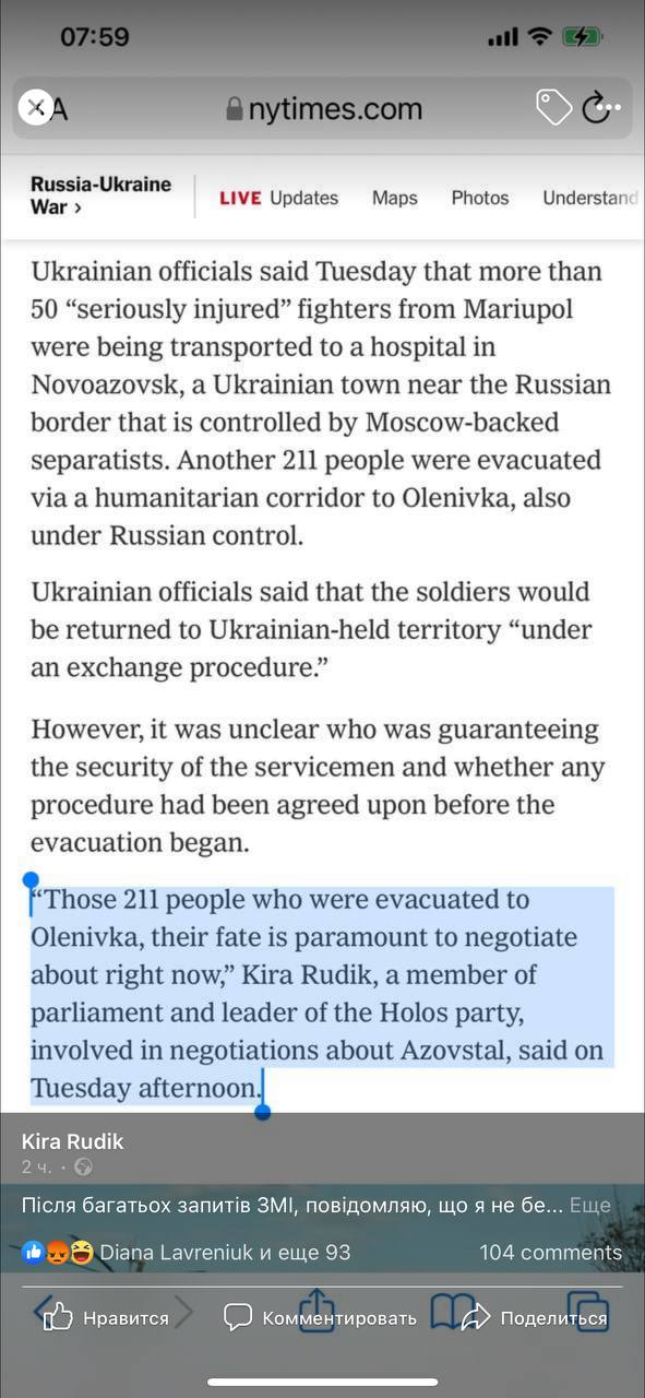 08:08 Механизма обмена защитников Мариуполя между Киевом и Москвой на данный момент нет. Об этом в комментарии The New York Times заявила нардеп Кира Рудык, принимавшая участие в переговорах с Россией.