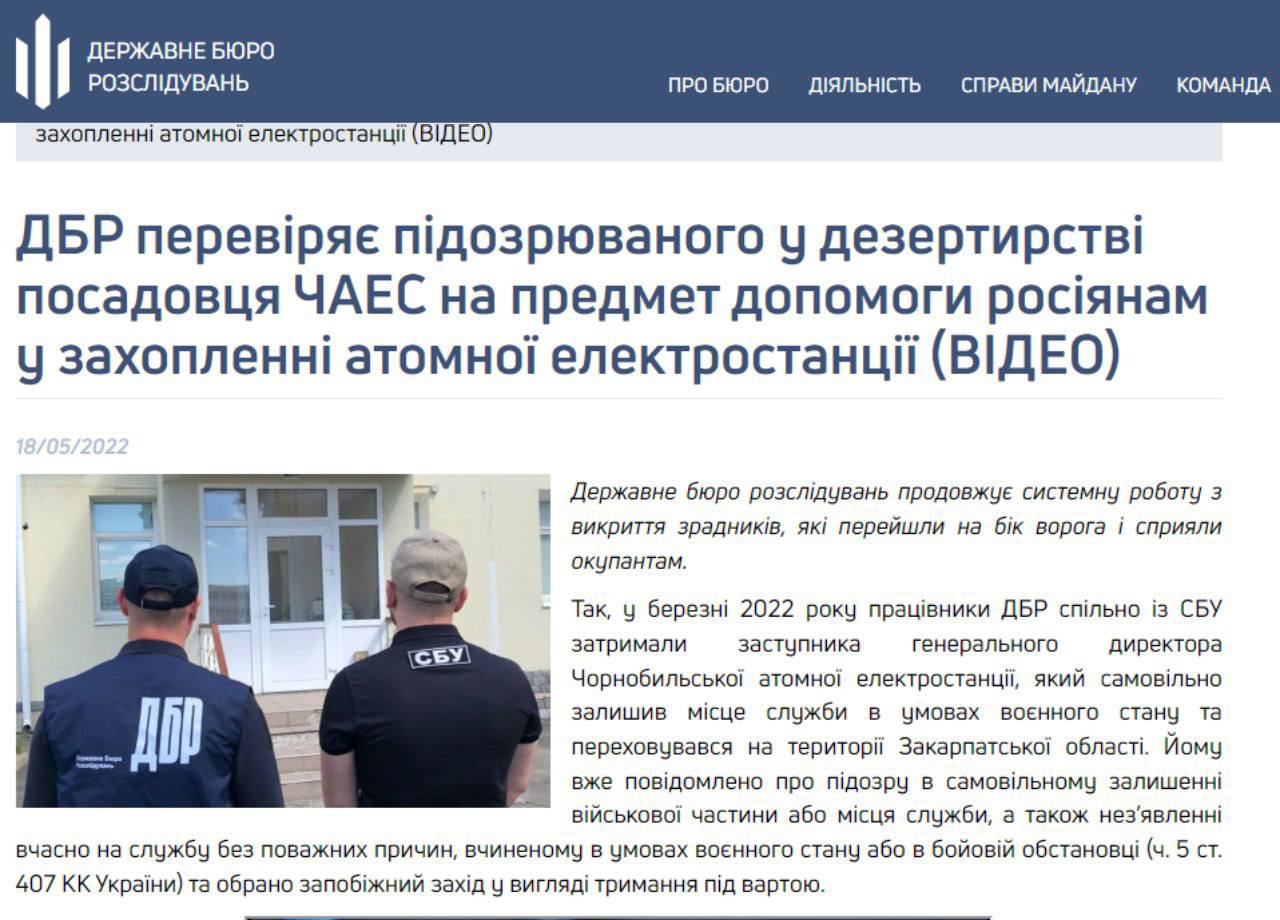 Однако в ходе следствия работники ГБР также проверяют возможную причастность чиновника к проведению подрывной деятельности против Украины – в частности, способствовал ли он военным России в захвате ЧАЭС в конце февраля.
