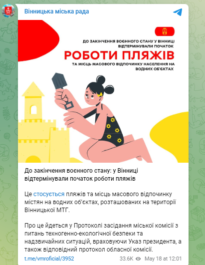 Власти Винницы решили не открывать пляжный сезон в областном центре до окончания военного положения. Об этом сообщает местный горсовет со ссылкой на Протокол заседания городской комиссии по техногенно-экологической безопасности и чрезвычайным ситуациям.