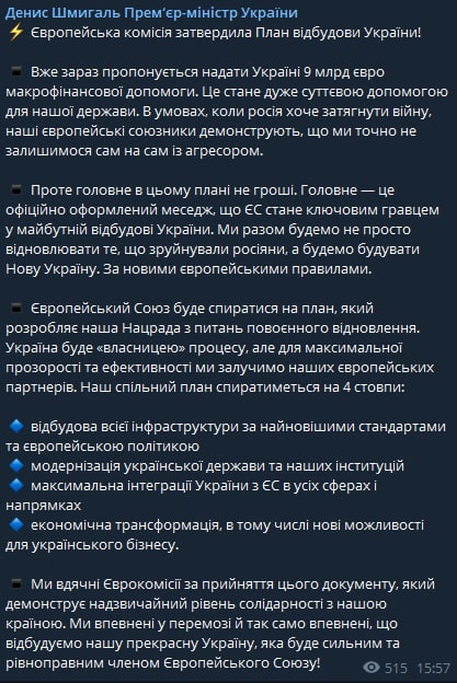 "Уже сейчас предлагается предоставить Украине 9 млрд евро макрофинансовой помощи. Это станет очень существенной помощью для нашего государства. В условиях, когда Россия хочет затянуть войну, наши европейские союзники демонстрируют, что мы точно не останемся один на один с агрессором", - сообщил он