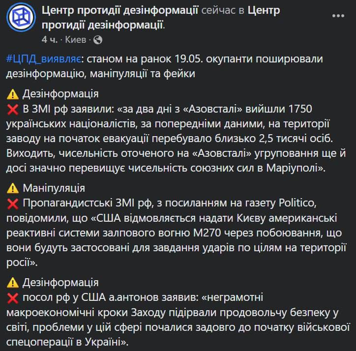 "Пропагандистские СМИ России со ссылкой на газету Politico сообщили, что "США отказывается предоставить Киеву американские реактивные системы залпового огня М270 из-за опасений, что они будут применены для нанесения ударов по целям на территории России", - говорится в центре противодействия дезинформации.