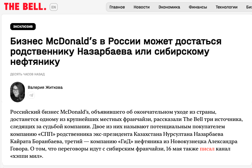 Окружение экс-президента Казахстана Нурсултана Назарбаева может выкупить российский бизнес McDonald’s. Компания недавно объявила об окончательном уходе из страны.