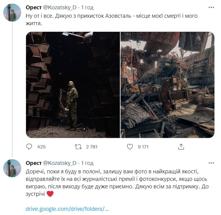 "Ну вот и все. Спасибо за убежище Азовсталь - место моей смерти и моей жизни. Пока я буду в плену, оставлю вам фото в хорошем качестве, отправляйте их на все журналистские премии и фотоконкурсы, если что-нибудь выиграю, после выхода будет очень приятно. Спасибо всем за поддержку. До встречи", - написал Орест.