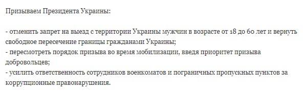 И призывают Зеленского разрешить выезд мужчин призывного возраста, в наборе в армию делать акцент на добровольцев, а для сотрудников военкоматов усилить ответственность за коррупцию.