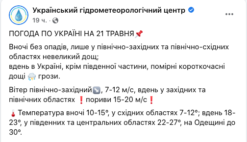 Украину ожидает не самая приятная погода на выходных. В субботу, 21 мая, в большинстве областей будут грозы и сильные порывы ветра до 20 м/с.
