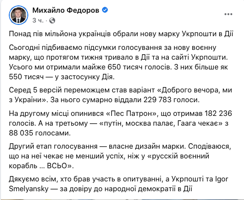 Минцифры подводит итоги голосования украинцев за тематику новой военной марки "Укрпочты". Победила тема "Доброго вечора, ми з України".