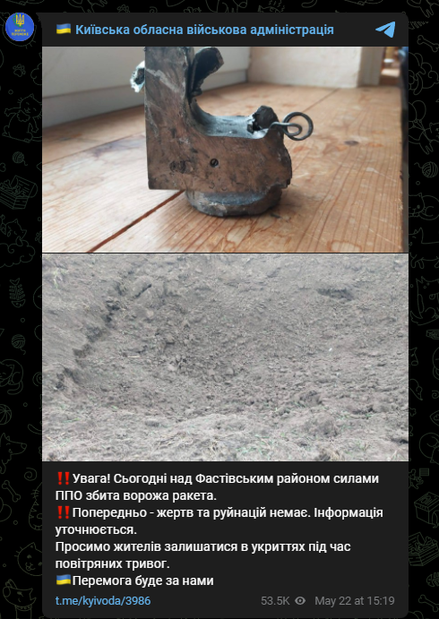 "Сегодня над Фастовским районом силами ПВО сбита вражеская ракета. Предварительно - жертв и разрушений нет. Информация уточняется. Просим жителей оставаться в укрытиях во время воздушных тревог", - говорится в сообщении администрации.