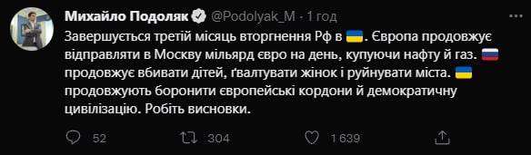 "Завершается третий месяц вторжения РФ в Украину. Европа продолжает отправлять в Москву миллиард евро в день, покупая нефть и газ. РФ продолжает убивать детей, насиловать женщин и разрушать города. Украинцы продолжают защищать европейские границы и демократическую цивилизацию. Делайте выводы", - говорится в сообщении.