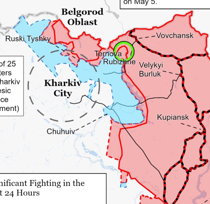 В отчете Института изучения войны (США) говорится, что российские войска отвоевали у ВСУ часть позиций к северу от Харькова - в том числе недавно освобожденное село Рубежное вблизи границы с Россией.