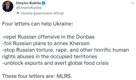 "Четыре буквы могут помочь Украине: отбить наступление русских на Донбассе, сорвать планы России по аннексии Херсона, остановить российские пытки, изнасилования и другие ужасные нарушения прав человека на оккупированных территориях, разблокировать экспорт и предотвратить глобальный продовольственный кризис. Эти четыре буквы: РСЗО", – написал он.