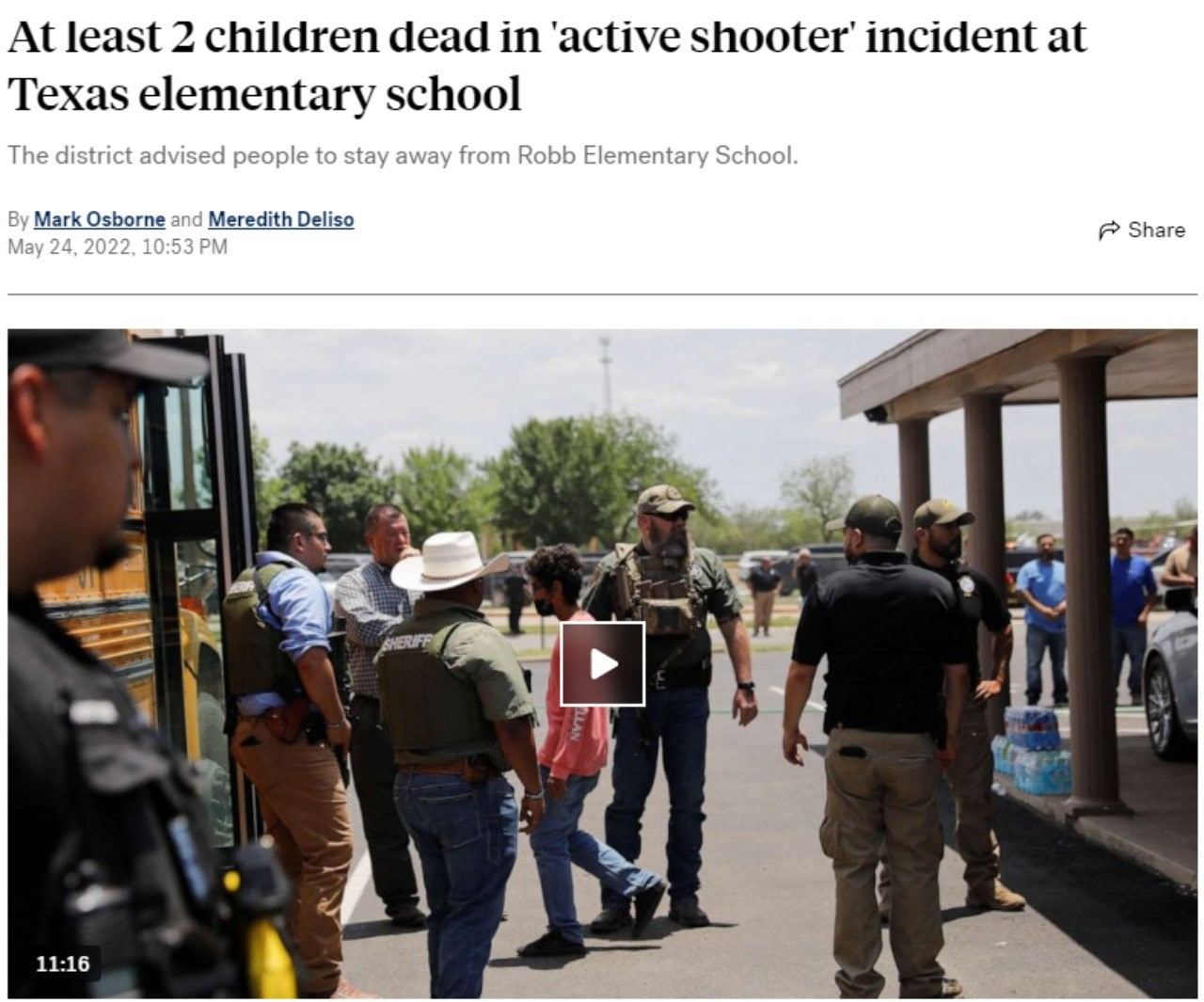 Позже появилось сообщение со ссылкой на губернатора штата Техас, что в начальной школе убиты 14 детей и учитель. Преступника застрелил полицейский.