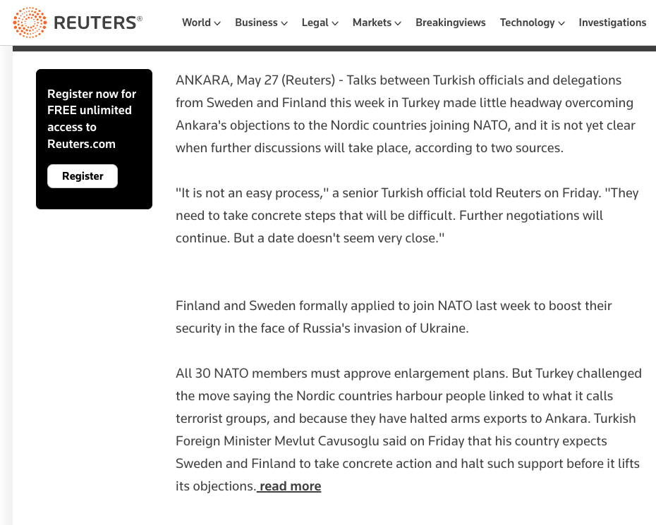На этой неделе состоялись переговоры Швеции и Финляндии с Турцией по поводу требований Анкары для вступления этих стран в НАТО. Стороны не сумели достичь особого прогресса в этом вопросе.