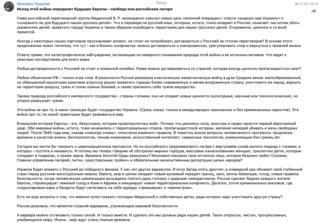Советник главы Офиса президента Украины и официальный член переговорной группы с РФ Михаил Подоляк предостерег Запад от переговоров с Москвой.