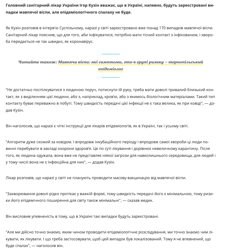 Главный санитарный врач Украины Игорь Кузин считает, что оспа обезьян дойдет и до Украины, но эпидемиологической вспышки не будет.