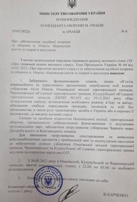 Соответствующий указ подписал комендант обороны города Очакова Виталий Харченко.