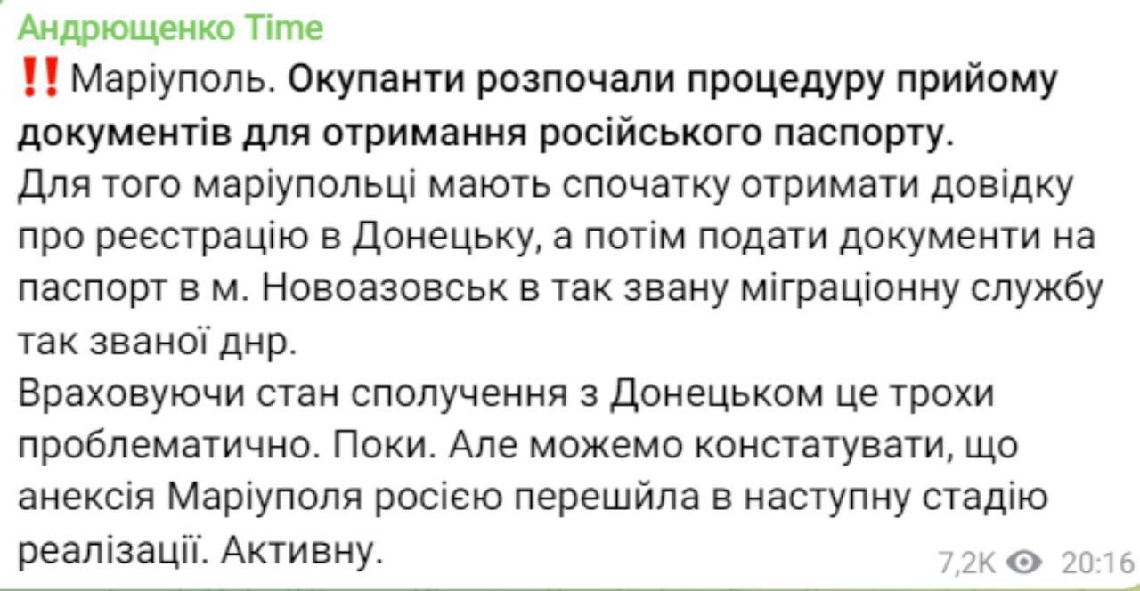 20.35 В Мариуполе подконтрольные России власти начали процедуру приема документов для получения российского паспорта.