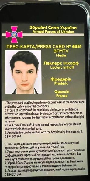 Из пресс-карты, которую опубликовал Гайдай, стало известно, что погибший журналист - сотрудник телеканала BFMTV Леклерк Имхофф.
