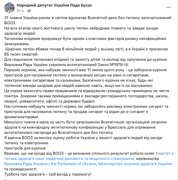 Член медицинского комитета Лада Булах отмечает, что принимали его для преодоления табачной эпидемии и защиты детей и молодежи от привлечения к курению.
