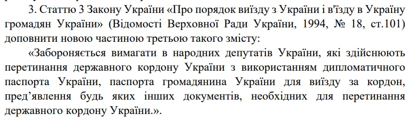 В законопроекте №7383, поданном 17 мая, предлагается убрать эту норму. И запретить пограничникам требовать у нардепов что-либо кроме паспорта - обычного или дипломатического.
