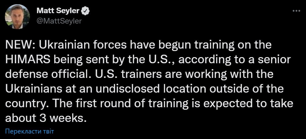 "По словам высокопоставленного представителя министерства обороны, украинские силы начали тренировки на HIMARS, отправленном США.
