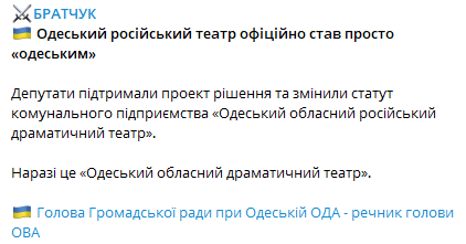Вслед за переименованием русского академического театра драмы Леси Украинки в Киеве, в Одессе убрали название "русский" из театра в Одессе. Таким образом, Одесский русский театр официально стал просто "одесским". Об этом сообщил спикер ОВА Сергей Братчук в Телеграм.
