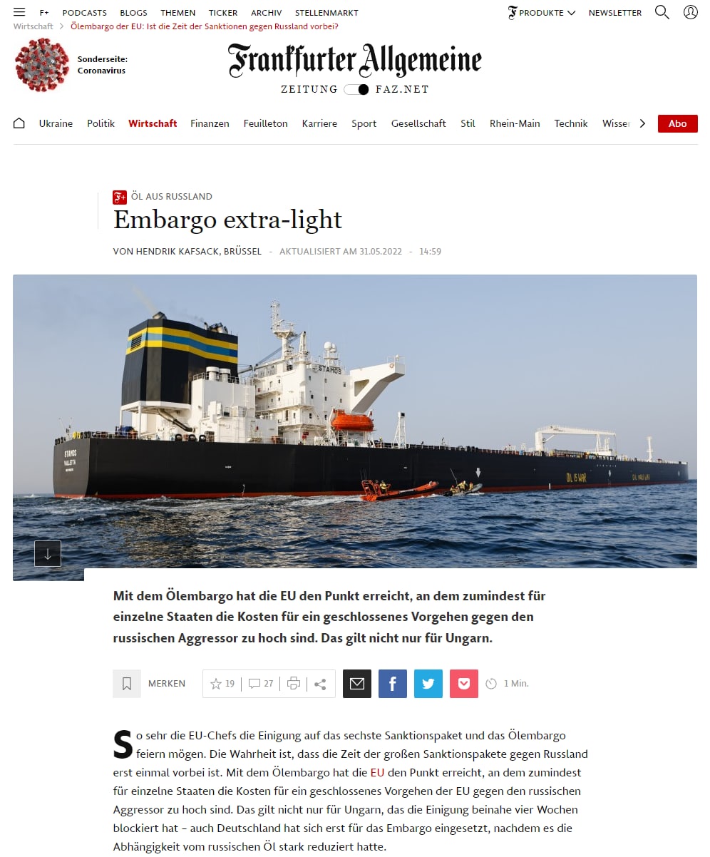 При том речь даже не о Венгрии, а о более сильных экономиках, в частности, в материале говорится, что "Германия приняла эмбарго только после того, как значительно снизила свою зависимость от российской нефти"