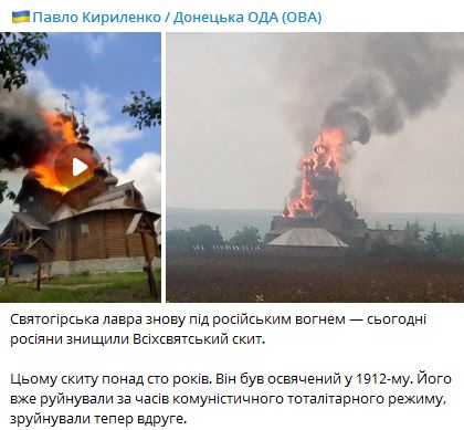 "4 июня поступило сообщение о масштабном пожаре в деревянном скиту Свято-Успенской Святогорской Лавры в честь Всех святых.