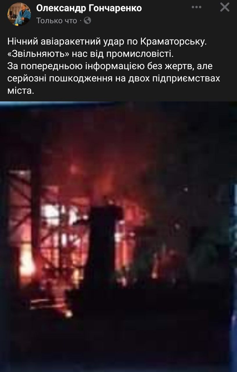 "Ночной авиаракетный удар по Краматорску. "Освобождают" нас от промышленности", - написал Гончаренко.