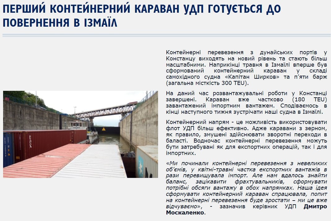 Первый контейнерный караван в составе самоходного судна "Капитан Ширков" и пяти барж готовится прибыть в Измаил в конце следующей недели. Сейчас разгрузочные работы в Констанце завершены. Караван загружен на 50% от запланированного количества.