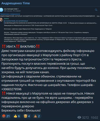 10:26 Мошенники распространяют информацию об организованной эвакуации из Мариуполя на 9 июня.