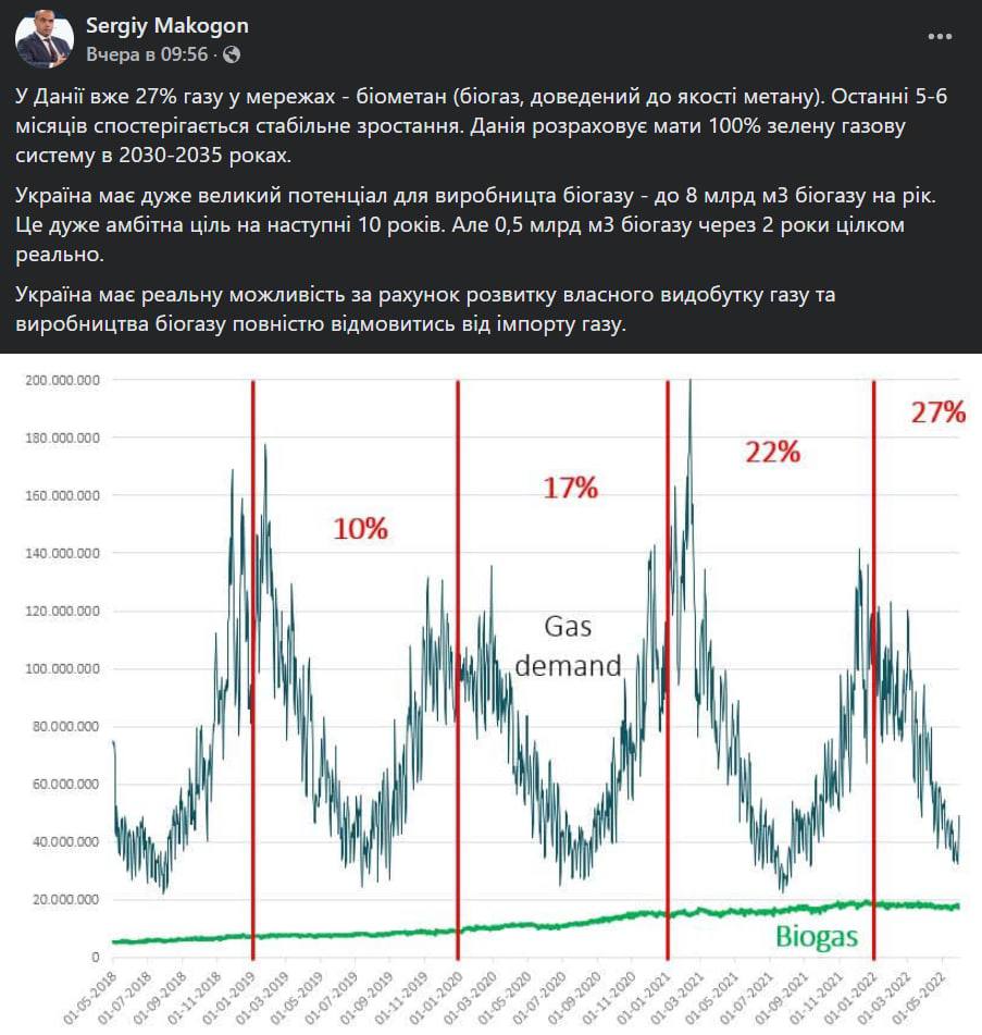 Макогон привел в пример Данию, где уже 27% газа в сетях – биометан, и в последние 5-6 месяцев наблюдается стабильный рост.