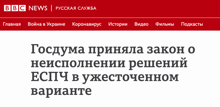 Госдума РФ сразу во втором и третьем чтениях приняла закон, разрешающий не исполнять решения Европейского суда по правам человека (ЕСПЧ), вступившие в силу после 15 марта 2022 года. Таким образом РФ ответила на исключение ее из Совета Европы.