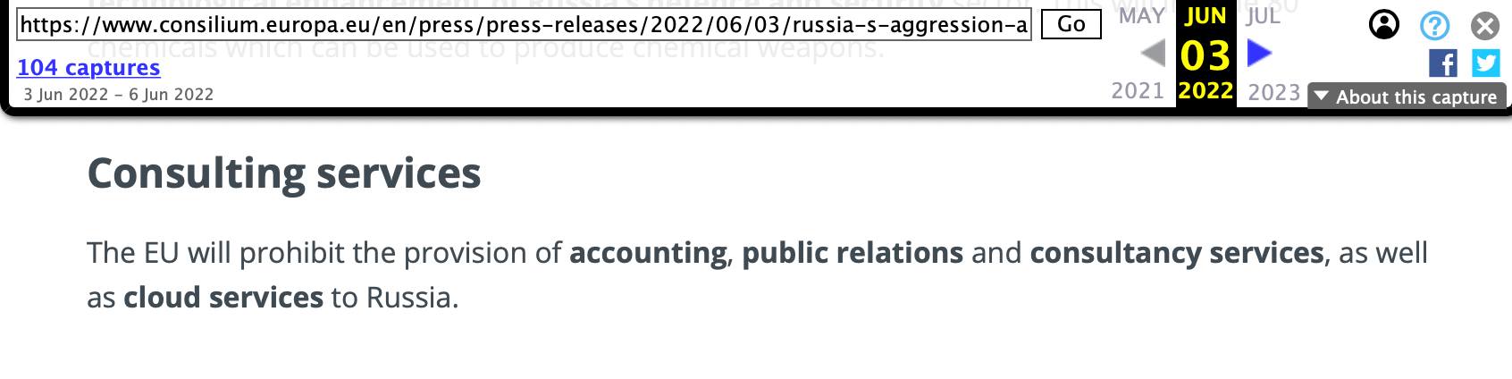 3 июня (в день объявления санкций) на сайте Совета ЕС появилось сообщение о санкциях, один из пунктов которого касался консультационных услуг.