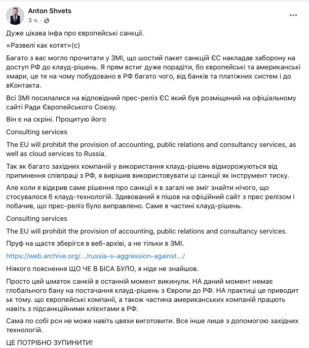 В пресс-релизе на сайте Совета ЕС о принятии шестого пакета санкций против РФ исчезло упоминание об ограничении работы облачных сервисов.
