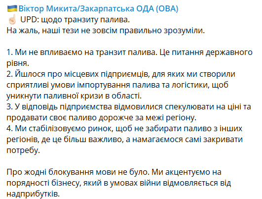 Однако позже Виктор Микита удалил данный пост из своего Телеграм-канале. Вместо этого глава ОГА объяснил свое заявление об отказе вывозить топливо за пределы области.