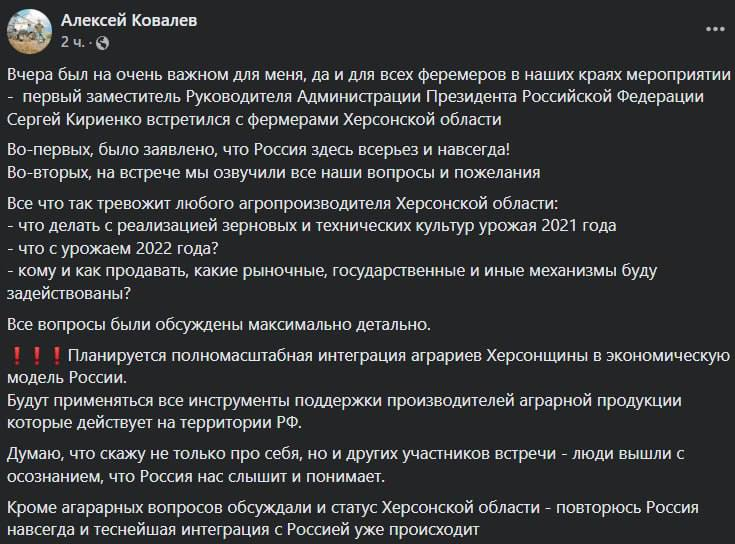 Кроме того, было обещано, что аграриев из захваченной Россией части Херсонской области интегрируют в экономику РФ и дадут им господдержку.